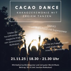 Tanz dich frei mit Kakao und schamanischen Beats Erlebe die heilende und herzöffnende Kraft von zeremoniellem Rohkakao- einem uralten Superfood mit Superpower! Durch freies Tanzen verstärken wir die Wirkung von Kakao und können loslassen, in innere Verbindung kommen und inspirierende Energie tanken. Zeremonieller Rohkakao öffnet dein Herz und bringt dich auf eine sinnliche Reise zu […] ...